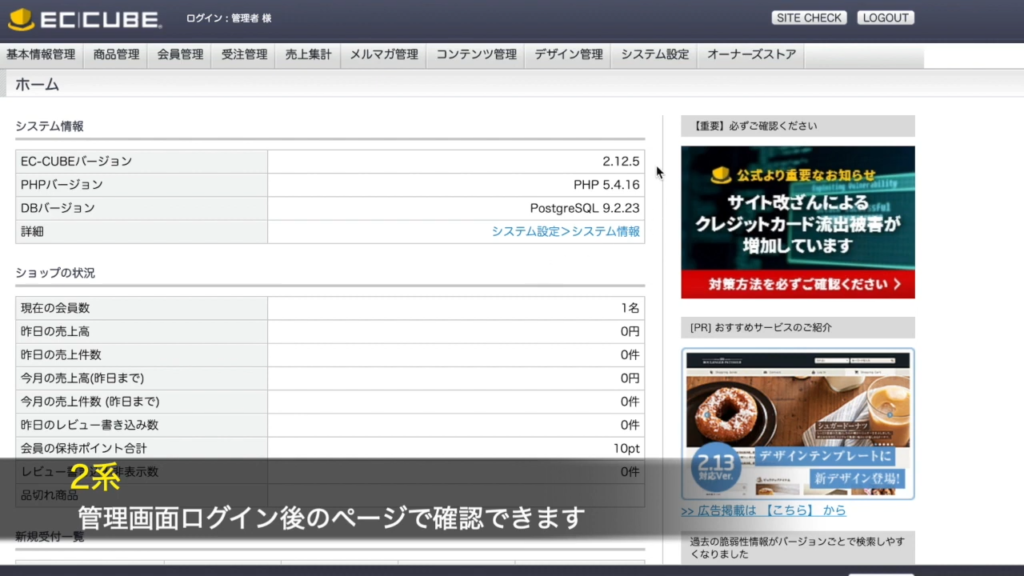 各サイトの管理画面にログインして確認する方法です。EC-CUBE管理画面にログインできる状態であれば確認可能です。